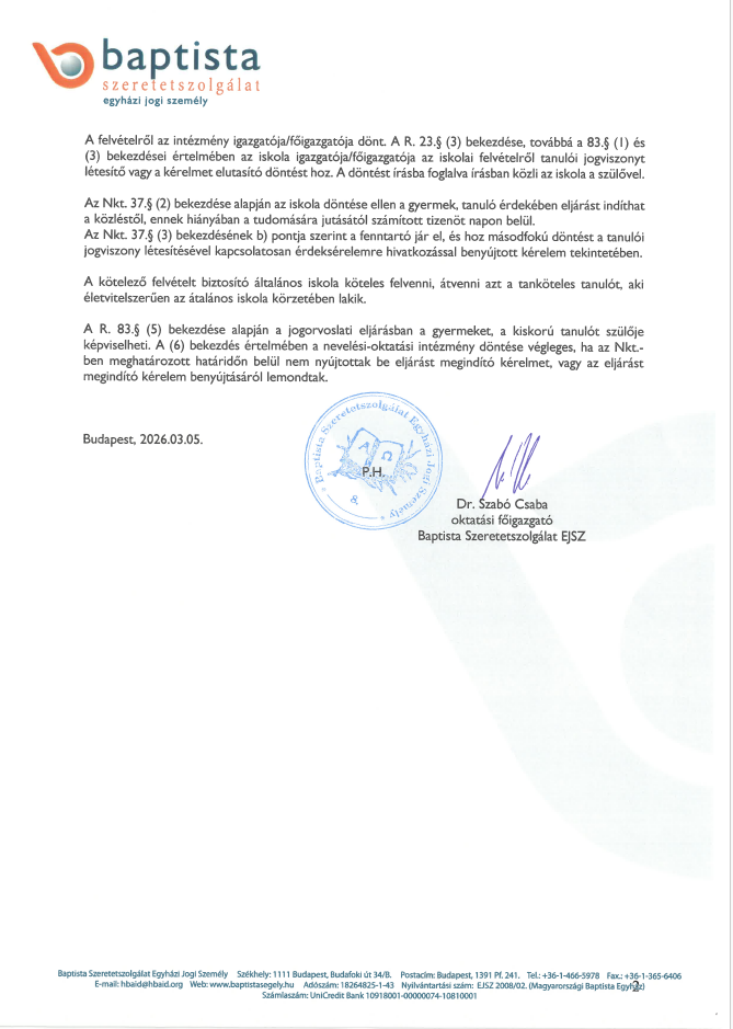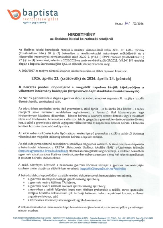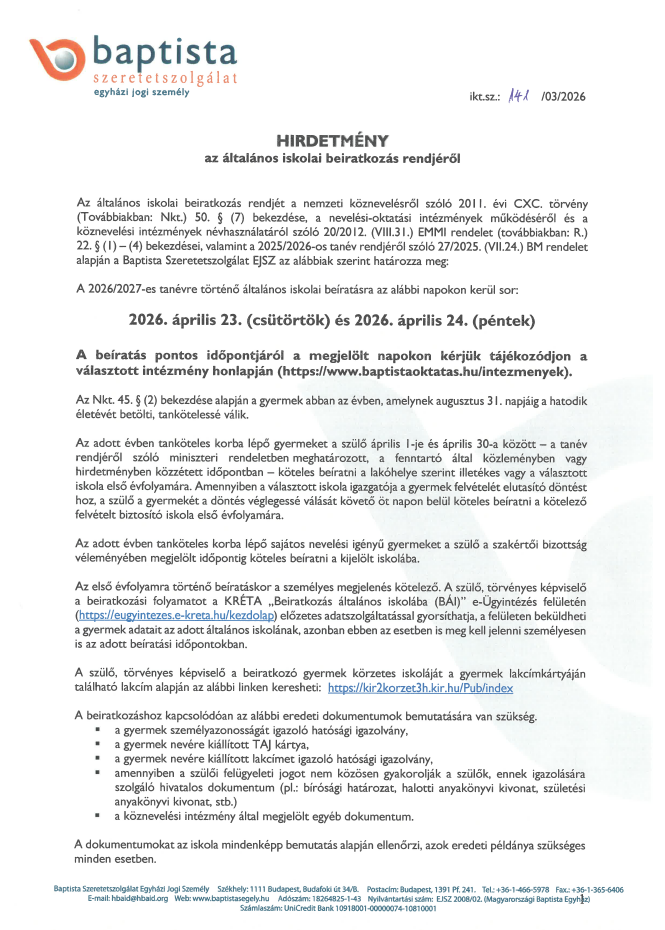 Hirdetmény az általános iskolai beiratkozás rendjéről